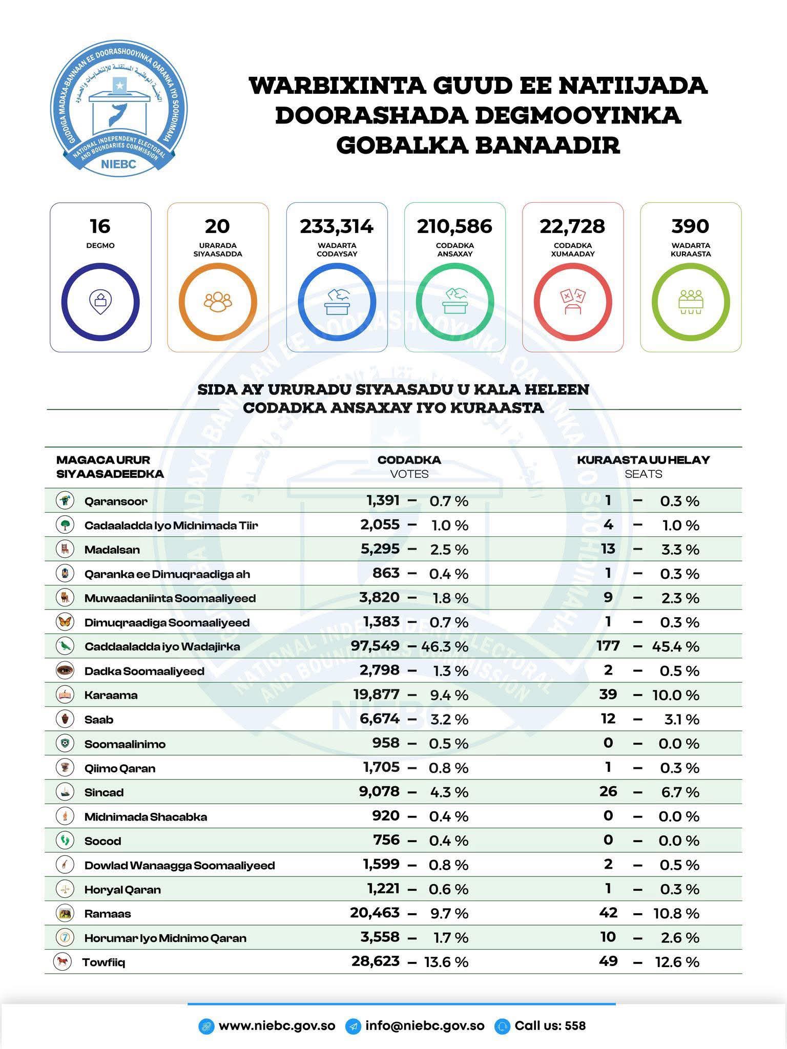 Guddiga Madaxa-bannaan ee Doorashooyinka Qaranka (NIEBC) ayaa si rasmi ah u soo saaray natiijada kama dambaysta ah ee doorashada degmooyinka Gobolka Banaadir, taas oo ka qabsoontay 16 degmo.